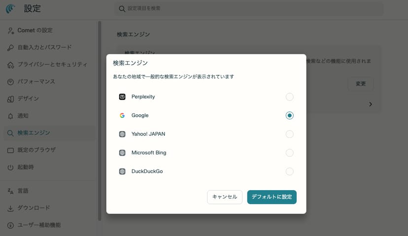 このようなデフォルト検索エンジンの変更は、ChatGPT Atlasでは行えない(2025年10月現在)ため、Perplexity Cometの方がよりユーザーに柔軟な選択肢を残していると言える。