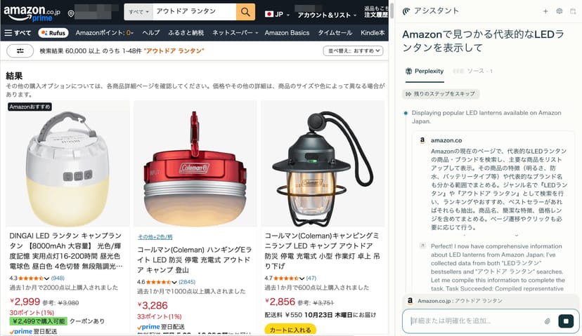 例えば、「Amazonで見つかる代表的なLEDランタン」を尋ねてみると、Cometが勝手にAmazonを開いて「LED ランタン」「アウトドア ランタン」などと関連キーワードで検索を行い、「おすすめ順」「ベストセラー順」でソートして、主要な商品をリストアップしてくれた。