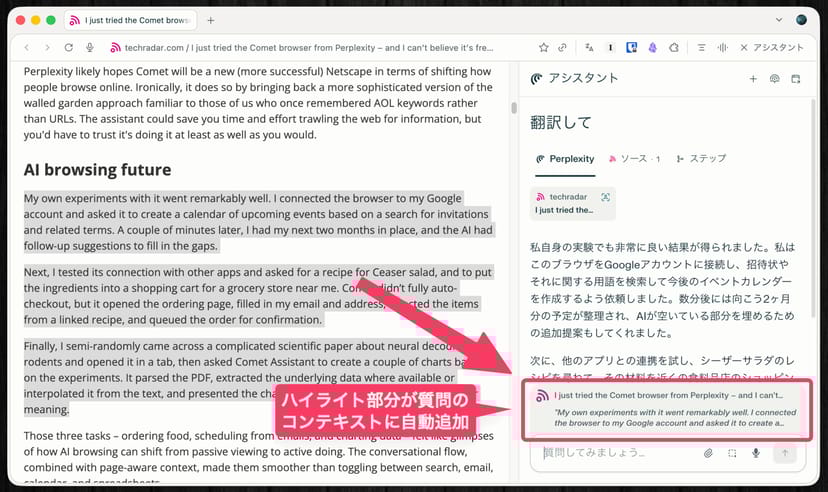 また、閲覧中のページの一部をハイライトした状態でアシスタントに指示を送ると、選択部分をアシスタントが読み取った上で質問に回答してくれる。