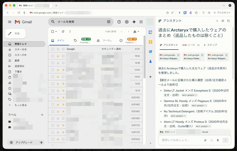 例えば「過去にこのブランドで購入した商品を整理して」などどCometに指示すると、Gmail上の何年も前のメールを遡って検索し、購入履歴を箇条書きで書き出してくれた。