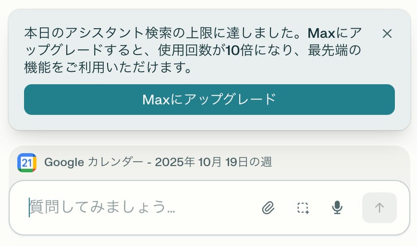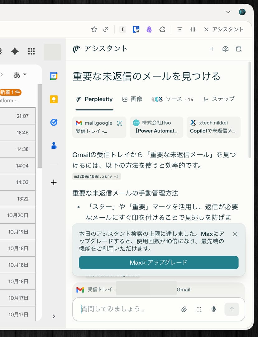 2025年10月20日現在、Perplexityの公式サイトを見ても上限が明記されていないが、Comet アシスタントを利用した高度なエージェント機能(ex. Gmail検索、ブラウザ操作、フォーム入力など)には、プランによって、1日あたりの利用回数の上限が存在するようである。