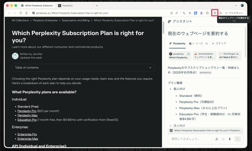 また、Cometブラウザ右上のアイコンをクリックすると、「現在のWebページを要約する」ことも瞬時に可能である。