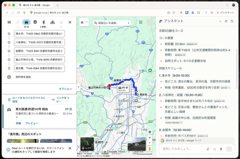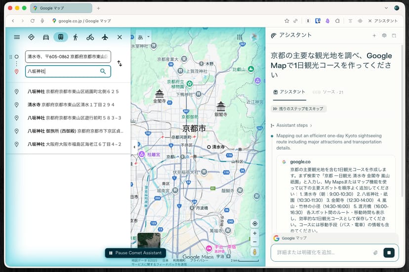 Googleマップから必要な目的地を見つけ出し、複数の地点を巡るルートマップを作成する、というかなり複雑な作業をCometに委任してみる。