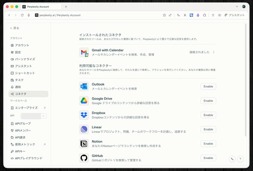 PerplexityおよびPerplexity Cometは、「コネクタ」という他社サービスとの接続機能がある。