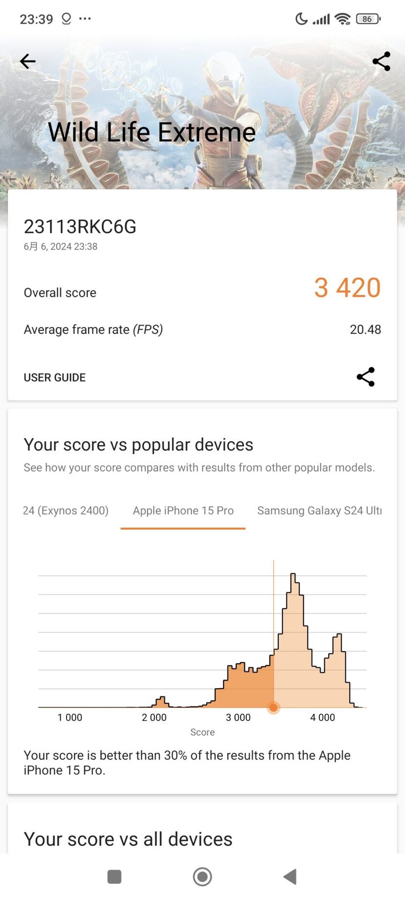 3DMarkのアプリ上で記録のあるiPhone 15 Proのスコアの分布の下位30%に入るほどのスコアなので、POCO F6 Proのゲーミング性能は相当高いと言っていいだろう。