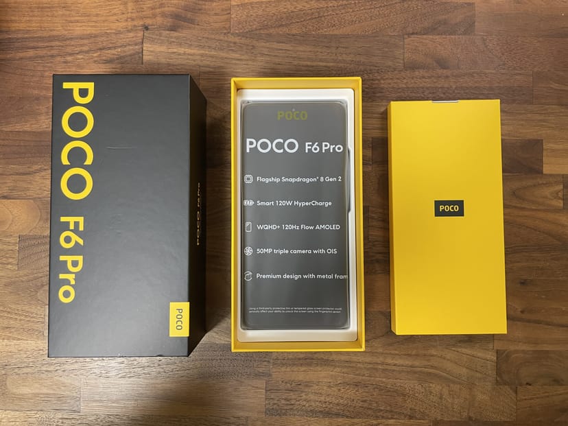 POCO F6 Proは、以下のような黒と黄色のボックスに入って届く。