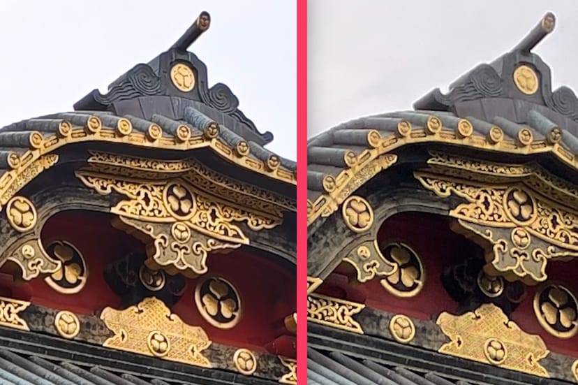 左半分がPOCO F6 Proで撮影した画像をズームインしたもの、右半分がiPhone 12で撮影した画像をズームインしたものだ。