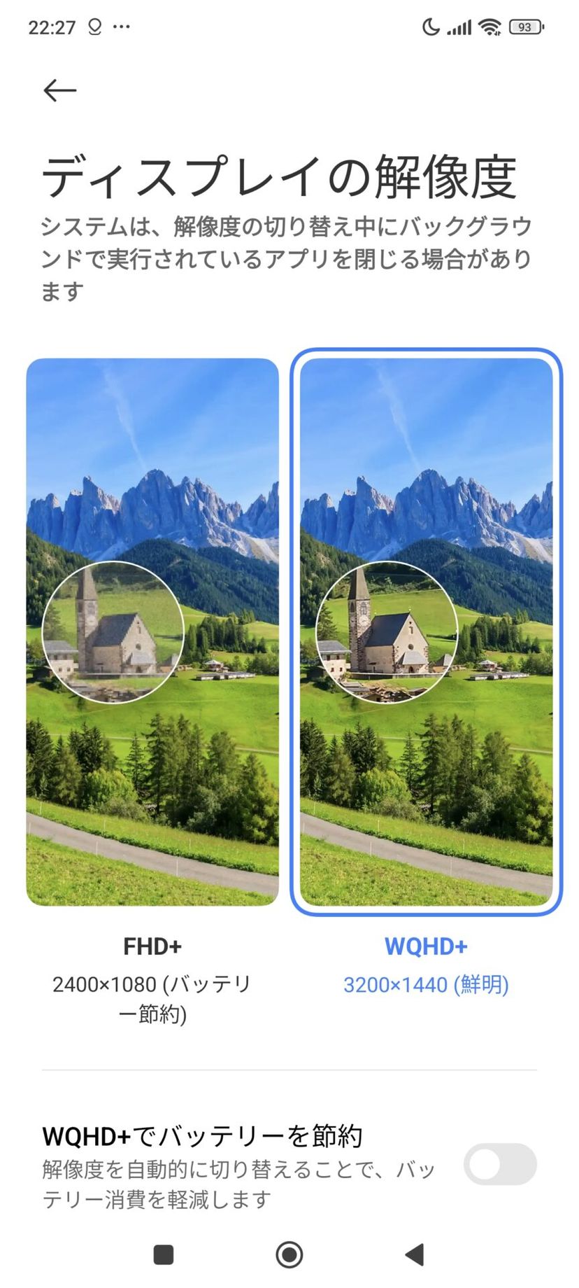 設定からディスプレイの解像度を変更することもでき、バッテリーの節約のため、自動でWQHD+とFHD+を切り替えさせることもできる。