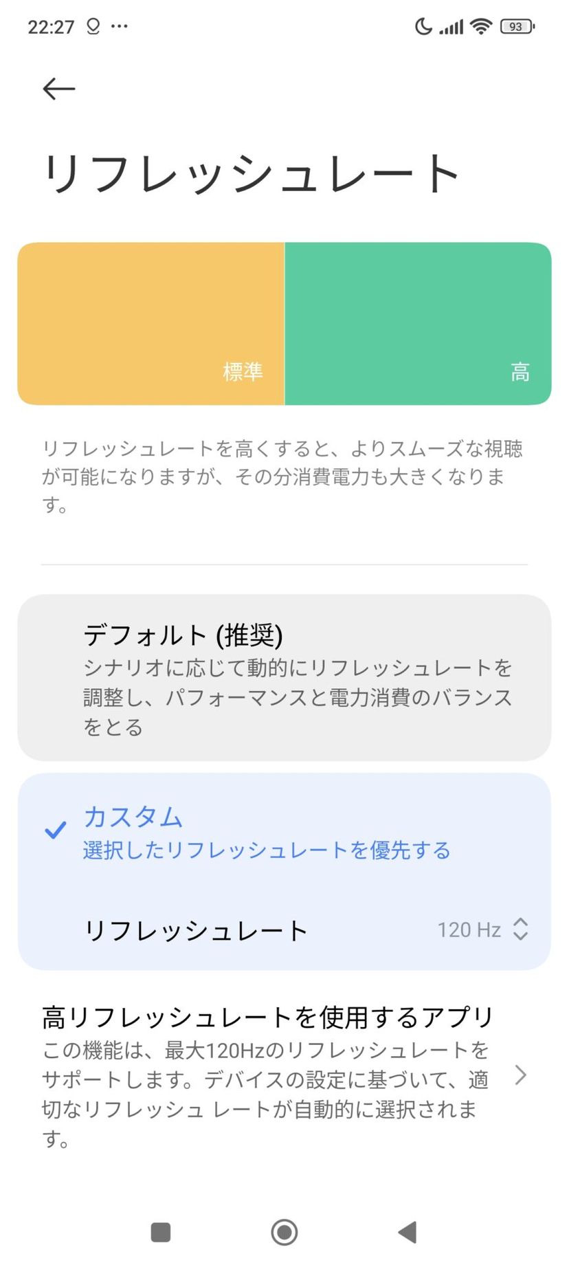 POCO F6 Proは、設定でリフレッシュレートも変更することができ、使用するアプリに応じて120Hzと60Hzを自動で切り替えてくれる設定も用意されている。