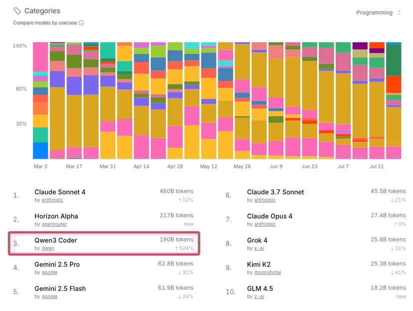 実際、様々なAIモデルのAPIサービスを提供しているOpen Routerが公開している「プログラミング」分野での使用量ランキングでも、Qwen3 Coderは、Claude Sonnet 4に次ぐ人気となっている。