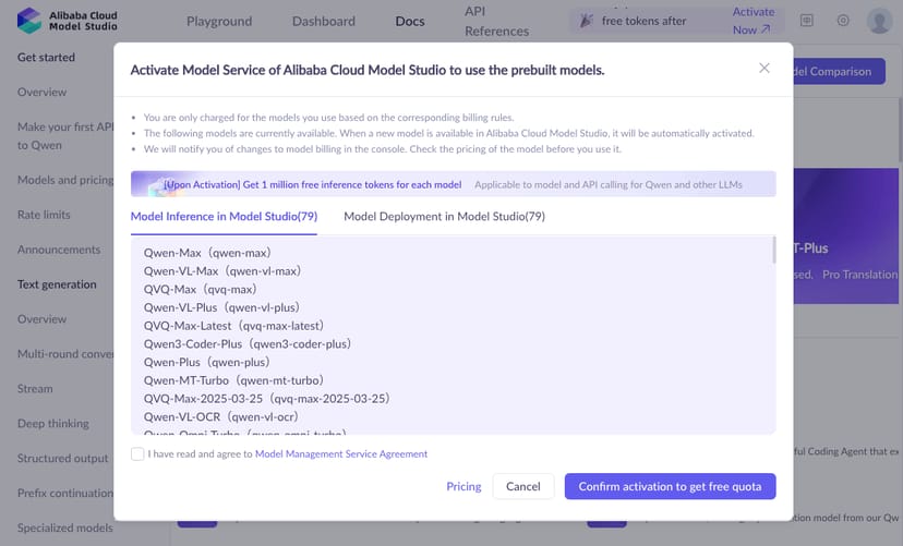 Qwenシリーズのモデルは、アリババクラウドのAPI経由で利用すると、会員登録時に各モデル100万トークンの無料枠がもらえる。