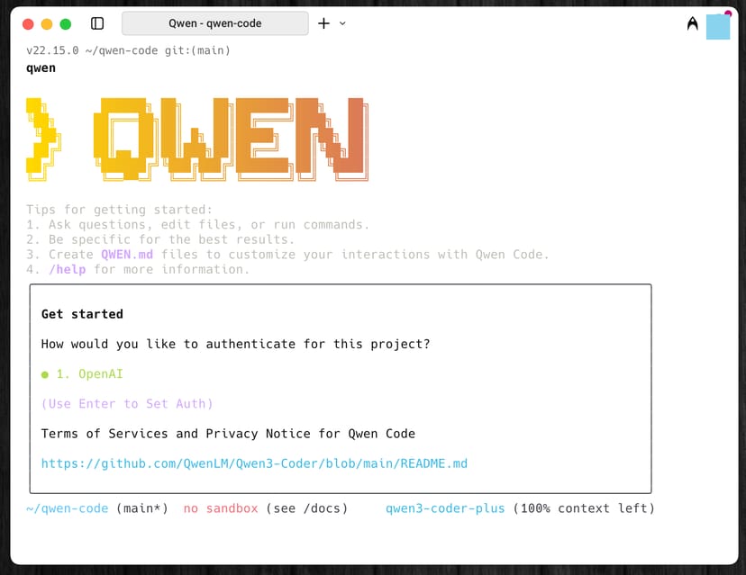 export OPENAI_API_KEY="ここに自分のAPIキーをコピペ"export OPENAI_BASE_URL="https://dashscope-intl.aliyuncs.com/compatible-mode/v1"export OPENAI_MODEL="qwen3-coder-plus"あとは、ターミナルでqwenと打ち込むだけで、以下のようにCLIツールのQwen Codeが起動する。