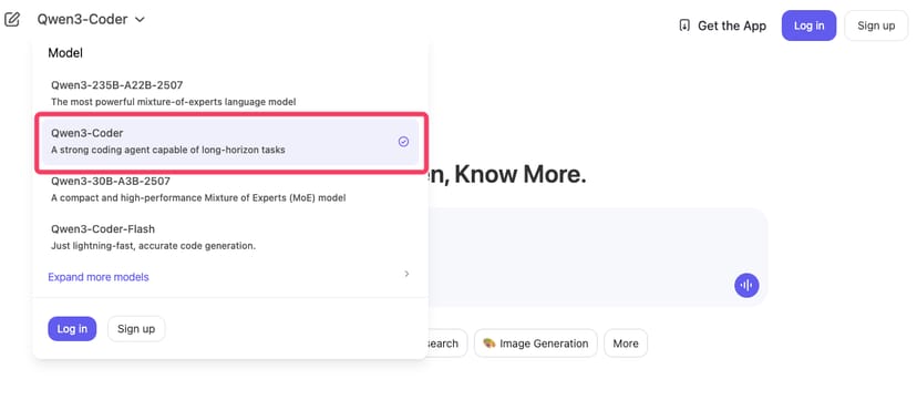 「Qwen Chat」では、Qwenの各モデルをプルダウンメニューで選んでチャットできるので、そこからQwen3 Coderも利用することができる。