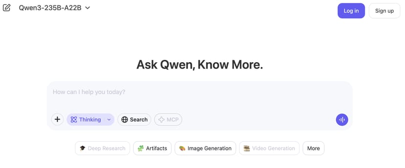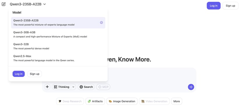ChatGPTのような見慣れたチャットUIインターフェースで、Qwen3-32B、Qwen3-30B-A3B、Qwen3-235B-A22Bなどの上位モデルを利用することができる。