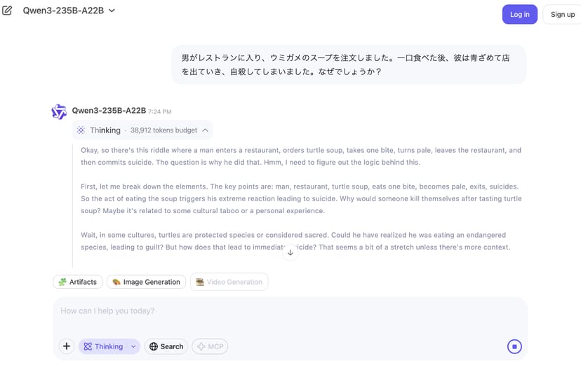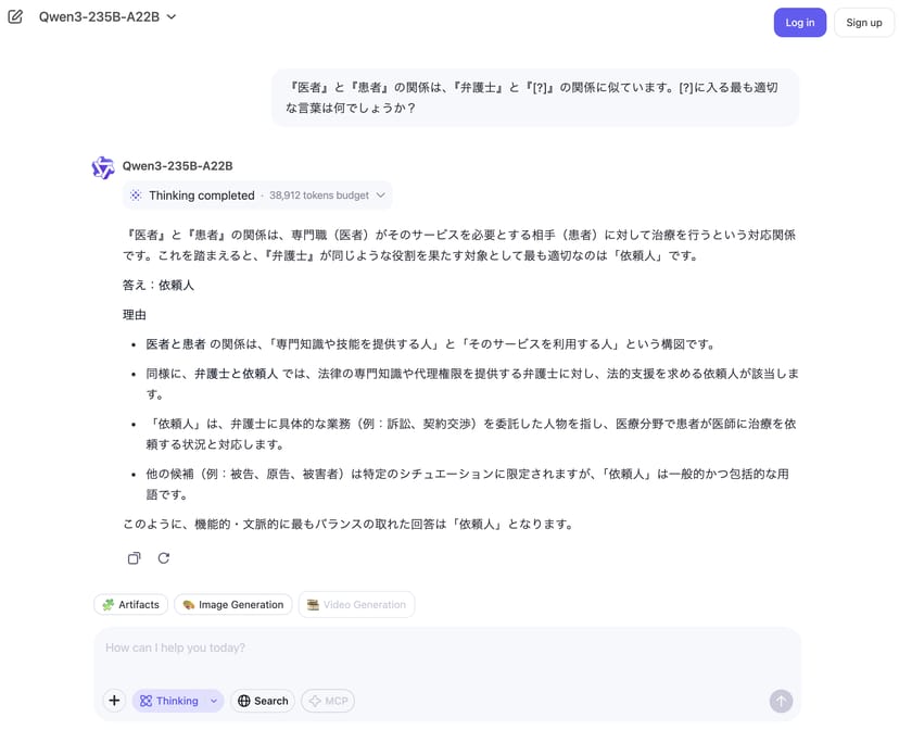 筆者がQwen3-235B-A22Bで様々なプロンプトを試してみたところ、日本語能力は非常に高いと感じた。ほとんど違和感のない日本語で会話をすることができる。