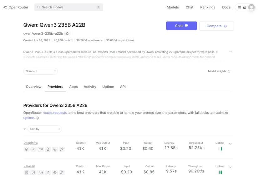 記事執筆現在(4月29日)、OpenRouterで「Qwen3 235B A22B」のプロバイダを確認すると、米国のクラウドコンピューティングサービスである「Deepinfra」や「Parasail」経由で利用できるようになっている。