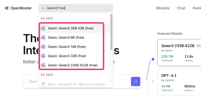 一方、送信したプロンプトなどの情報がトレーニングに使用されても良いのであれば、Qwen3のすべてのモデルについて、無料で利用できる選択肢も存在する(例:Qwen3 235B A22B (free))。