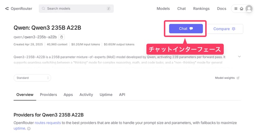 OpenRouterの各モデルは、APIを利用してPythonプログラム内などで呼び出すことができるが、Web上でモデルページから「Chat」ボタンを押すと、チャットUIでのチャットも利用できる。