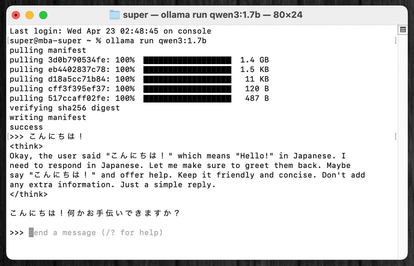 ターミナルで、ollama run qwen3:1.7bというコマンドを打ち込むだけで、モデルがローカル環境にダウンロードされ、さらにそのままチャットを開始できる。