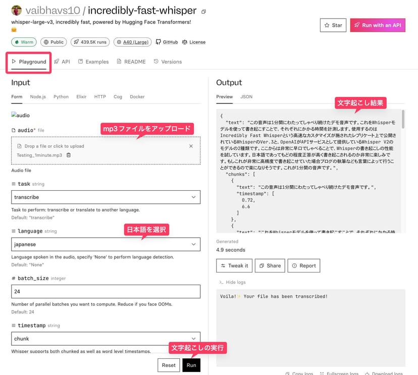例えば、Vaibhav Srivastav氏がReplicate上で公開しているvaibhavs10/incredibly-fast-whisperモデルは、その名の通り、「すっごい速いWhisper」である。