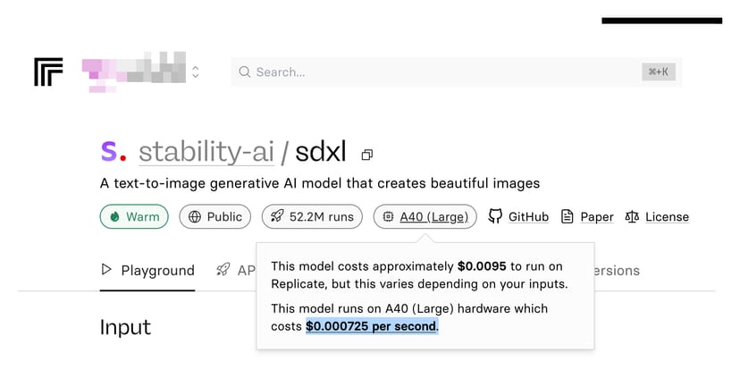 stability-ai/sdxlで使用されているGPUは、上で紹介したIncredibly-Fast-Whisperと同じNVIDIA A40 (Large)なので、画像生成にかかる時間1秒につき0.000725ドルを要する。