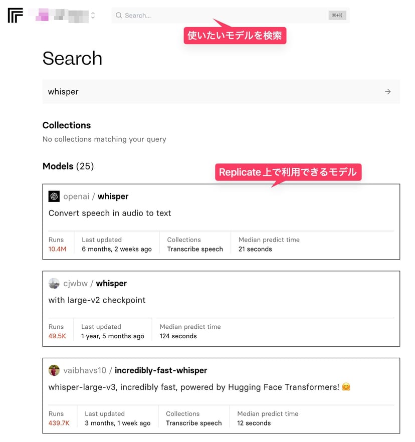 「Whisper」というモデル名で検索をして、OpenAIが公式で提供しているReplicateのWhisper v3モデルにアクセスしてみよう。