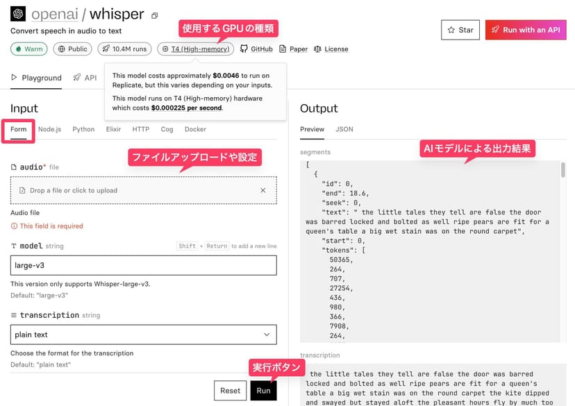 画面上部には、使用するGPUの種類が表示されている。GPUの種類によって、1秒あたりの利用料金は変動する。無料期間中は気にする必要はないが、OpenAIのwhisperの場合、1秒あたり0.000225ドル(=約0.03円)の「T4」という比較的低スペックなGPU上で動作することが分かる。