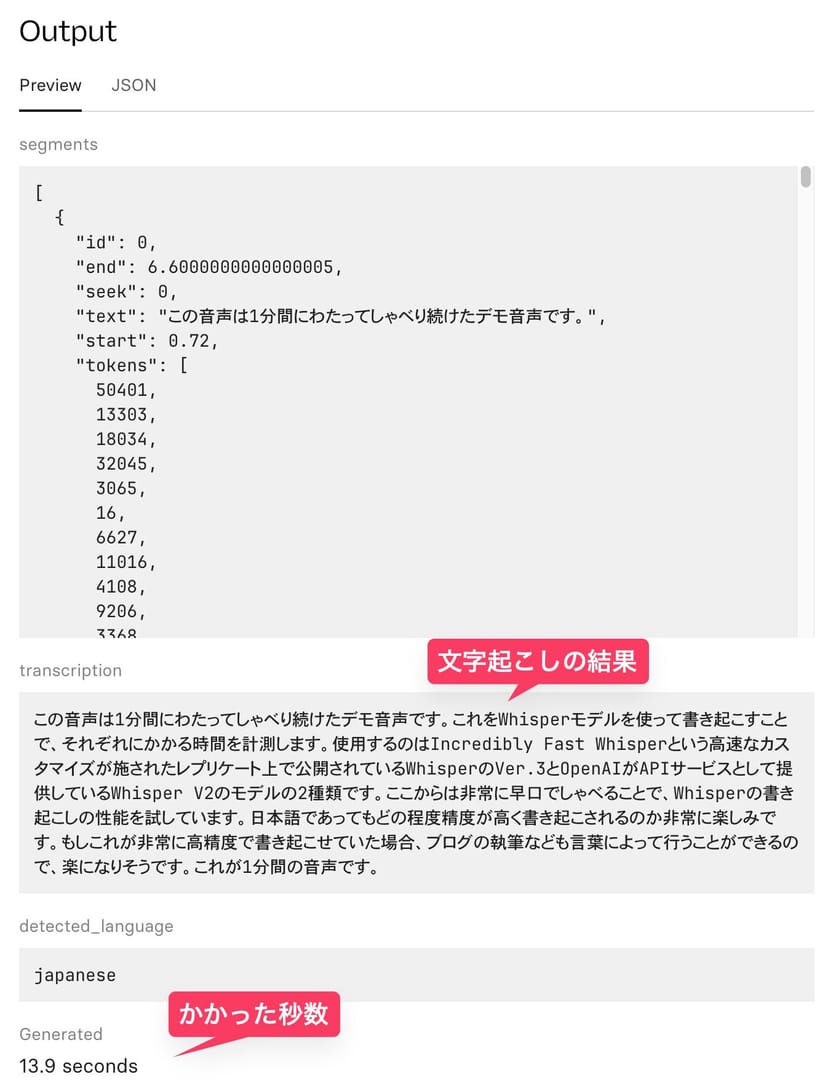 なお、OpenAIが自社で提供しているWhisperのAPIは、同じファイルを4.3秒で文字起こしできたので、もっと高スペックなGPUを使用していると思われる。