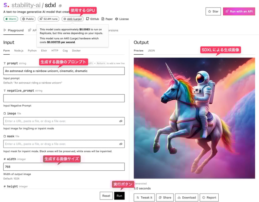 stability-ai/sdxlのページにアクセスすると、左側に生成する画像のプロンプト文やサイズの指定などを行うメニューがあり、「Run」ボタンをクリックすると、右側に画像が生成される。