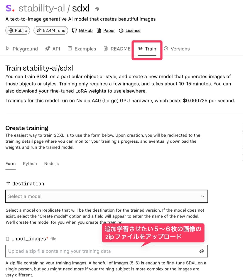 さらに、stability-ai/sdxlには「Train」というタブもあり、Replicate上でモデルのファインチューニングまで行うことができる。