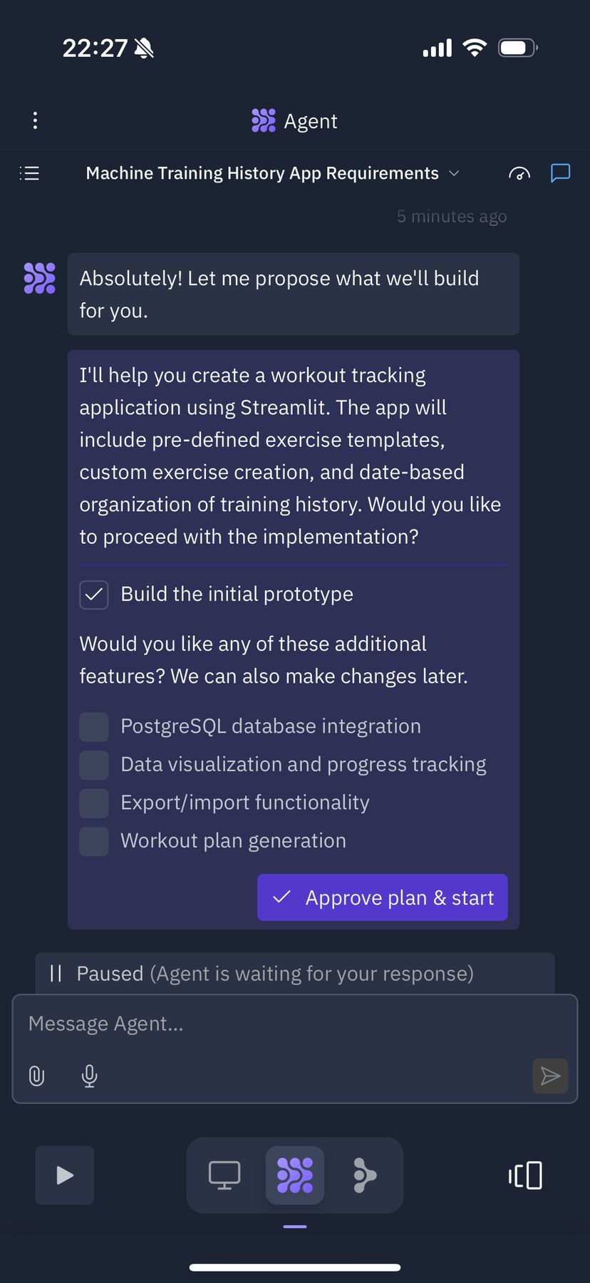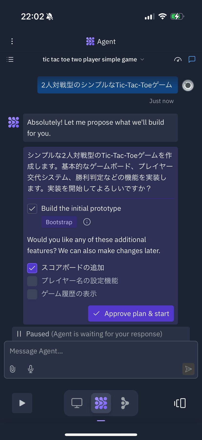 提案された中から、実際に追加したい機能があればチェックを入れて、「Approve plan & start」をタップするだけで、アプリの構築が開始される。