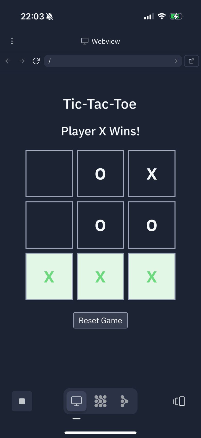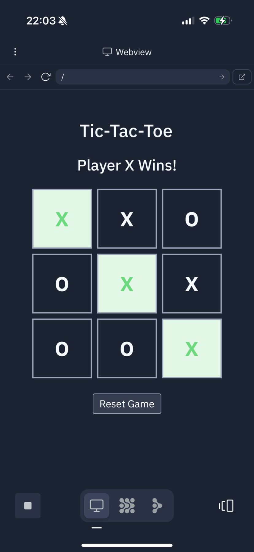 見事に三目並べゲームが完成しており、様々な勝敗パターンをタップしてみてもエラーは発生せず、「Reset Game」ボタンも正しく動作した。