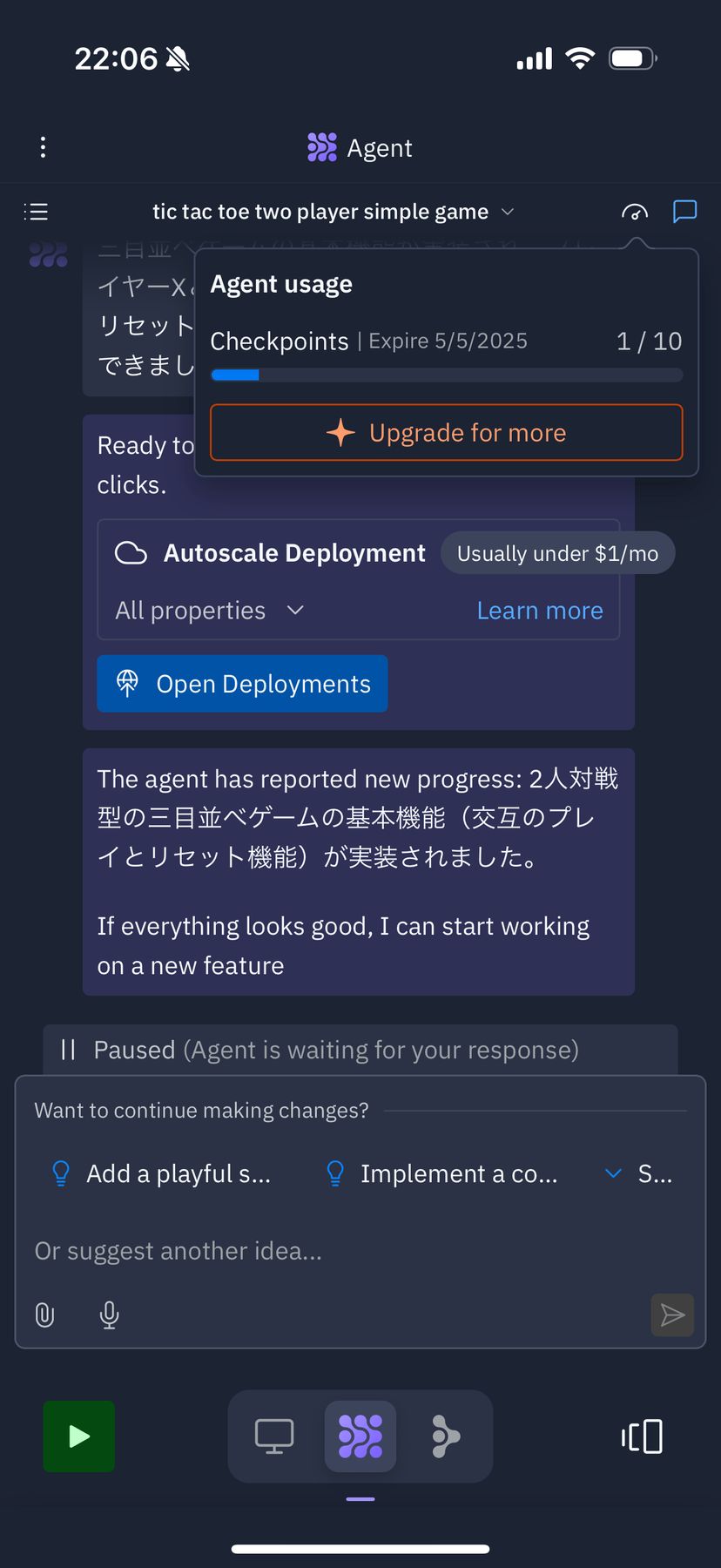 注目すべきは、スマホアプリでも「Replit Agent」という強力なAI機能が使えること。