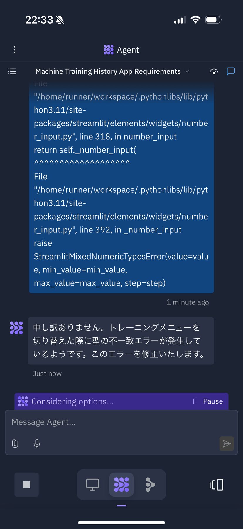 今回の場合、エラーメッセージを丸ごとコピペして、Replit Agentに「〜の操作をしたら、以下のエラーが出た」と伝えたところ、勝手にReplit Agentが原因を考えて修正を進めてくれた。
