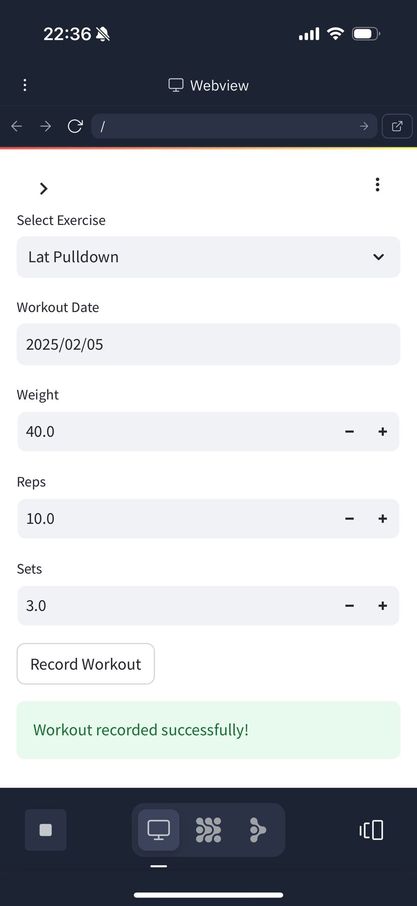 すると、ちゃんと一発でエラーが修正され、ランニングマシン以外のワークアウトについても、記録を入力できるようになった。