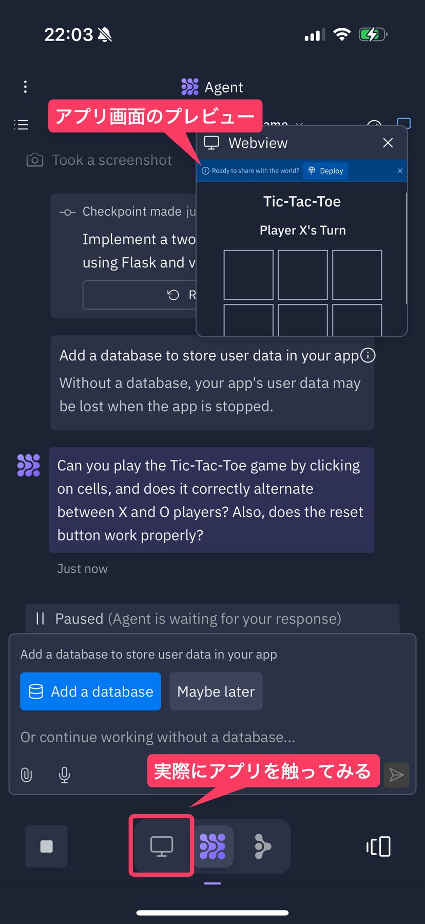ちなみに、途中でデータベースを追加するかどうかもAgentが質問してくるなど、アプリを実装する上で必要なオプションについて、AIの方から色々提案してくれることもある。