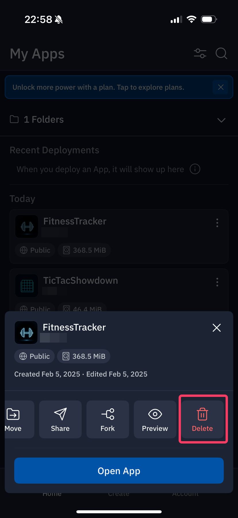 アプリの一覧から、削除したいアプリを選択して、メニューから「Delete」をタップすれば、アプリを削除することができる。