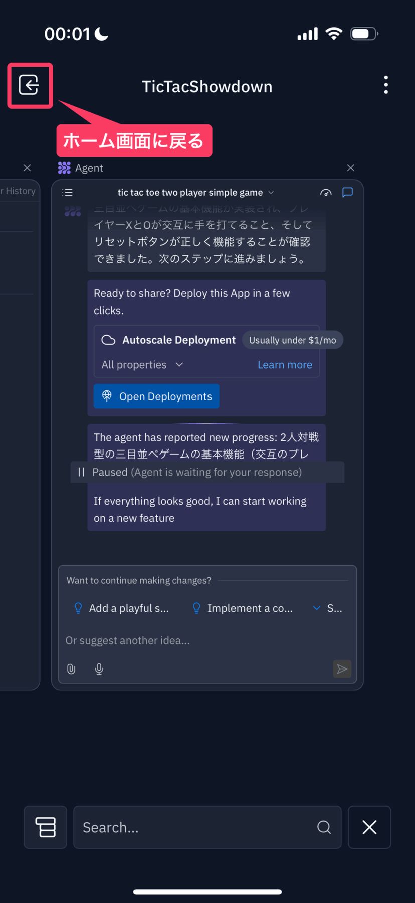 ちなみに、開発中のアプリからExitして、Replitアプリのホームに戻るには、まず画面右下にあるタブのようなアイコンをタップする必要がある。