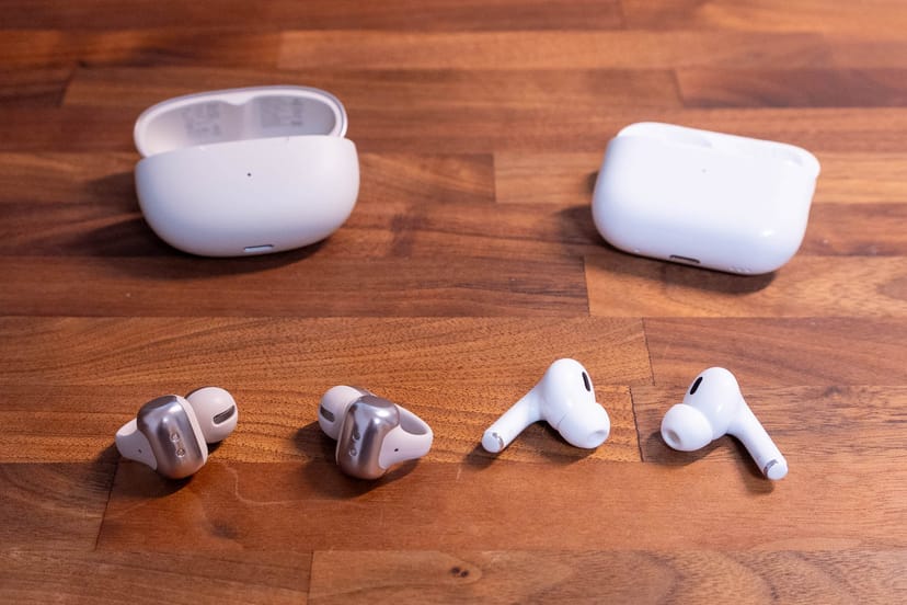 「OpenDots ONE」のようなオープンイヤー型(写真左)と、「AirPods Pro 2」のようなカナル型(写真右)の違いは、耳を密閉するかどうかだ。