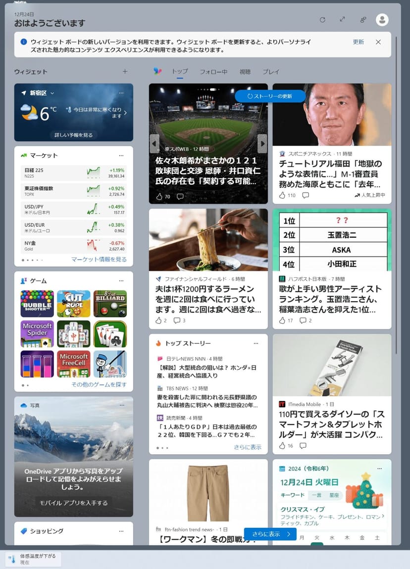 ウィジェットボードには、デフォルトで、天気予報や株価のほか、ゲームアプリの宣伝、MSNニュースのサムネイルが勝手に表示され、あまりにも目障りだ。