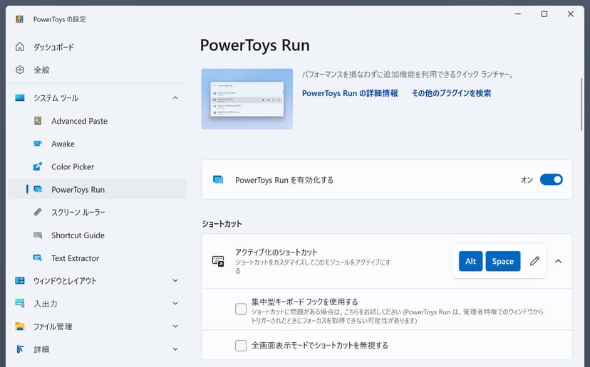 「PowerToys Run」を有効にすると、Alt + Spaceキーのショートカットで、どこからでもランチャーを呼び出すことができるようになる。