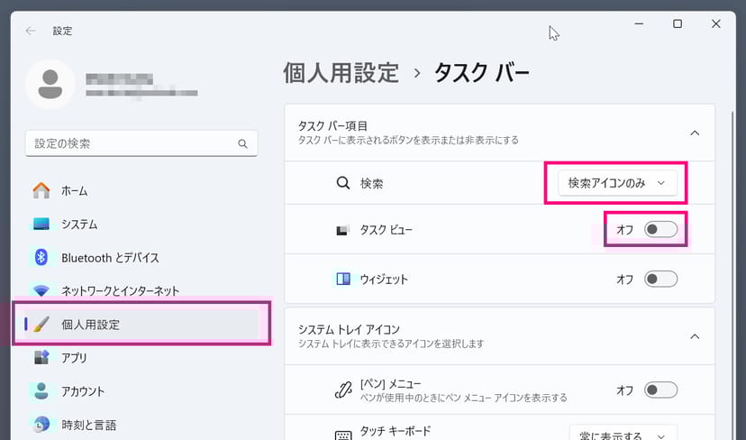 システムアイコンの表示/非表示の設定は、以下の手順で変更できる。