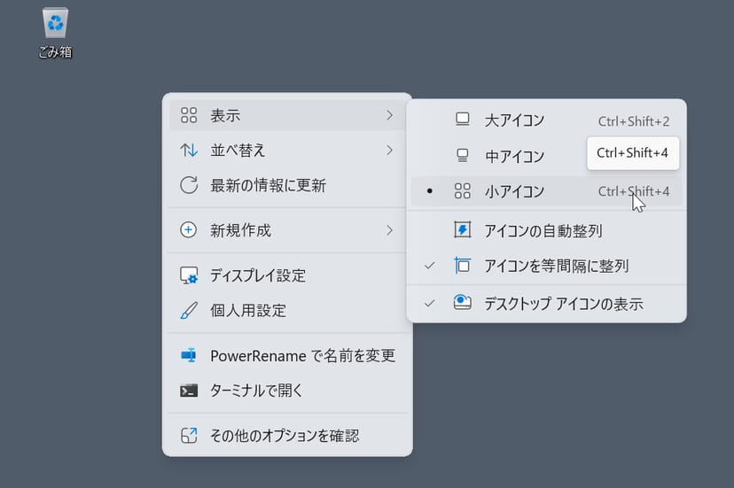 また、デスクトップを常に整理整頓しているクリーン派であっても、無駄に「ごみ箱」のアイコンがデカデカと表示されていると不格好なので、アイコンサイズを小さくするのがおススメだ。