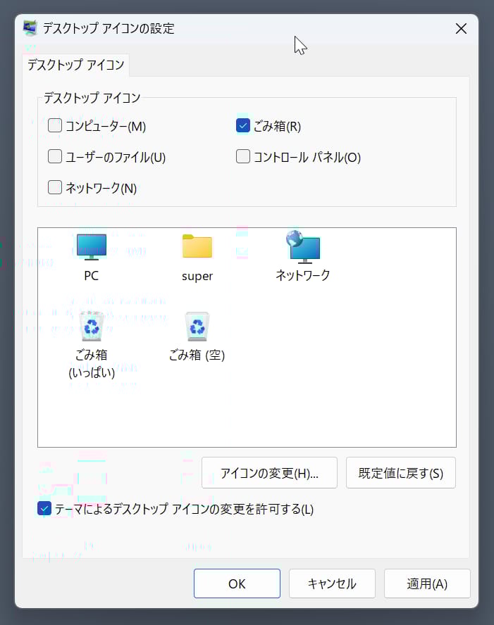 「デスクトップアイコンの設定」で、表示可能なシステムアイコンは以下の5つがある。