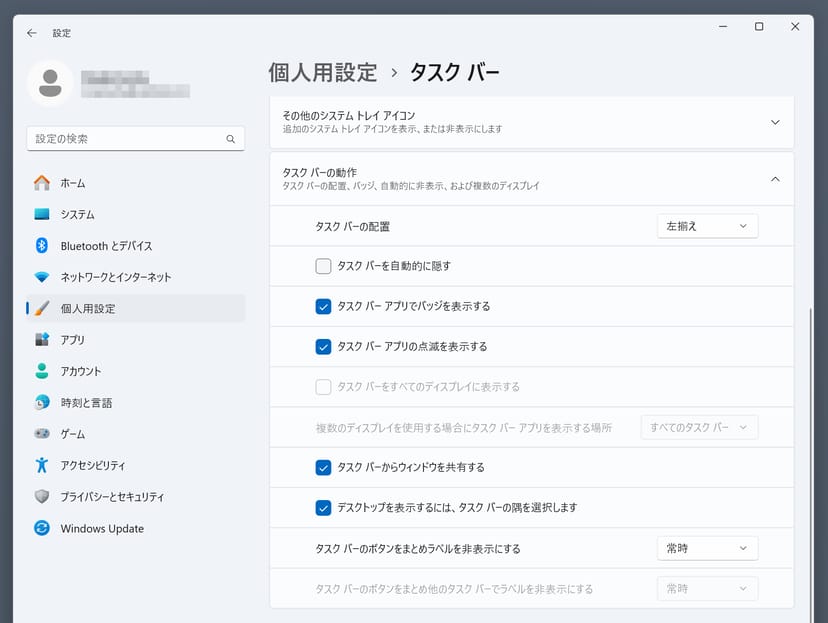 - 「タスクバーの配置」のドロップダウンメニューから、「左揃え」を選択