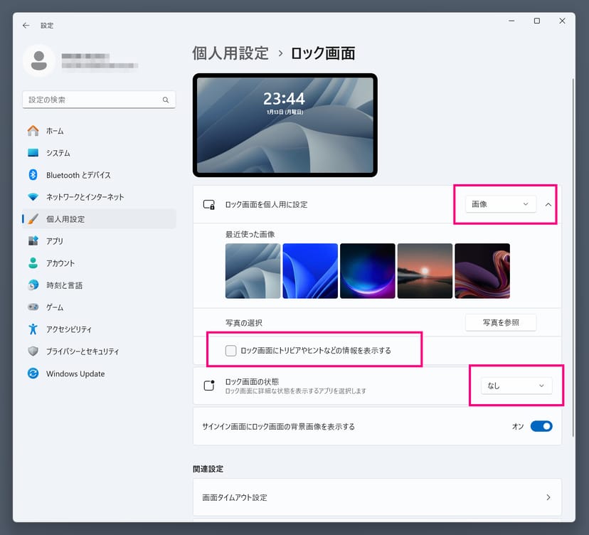 - 「ロック画面にトリビアやヒントなどの情報を表示する」のチェックを外す