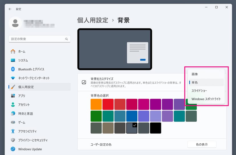 これによって、Windowsスポットライトによる自動的な壁紙の変更が停止され、自分の好きな画像を壁紙として設定したり、単色で固定したりといったことができる。