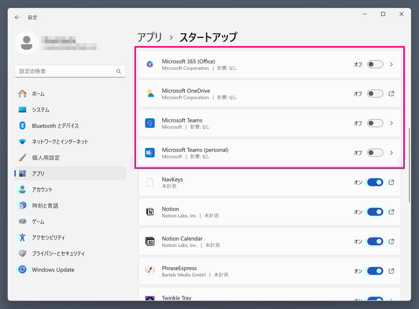 Windows 11では、OneDriveやTeamsなど、多くのアプリが自動的に起動するように設定されている。