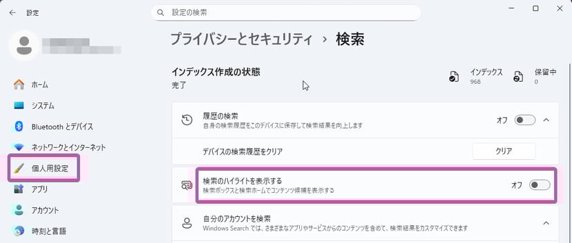 これもまた、迷わずにオフにしておくべき機能だ。以下の手順で、簡単に検索ハイライトを無効にできる