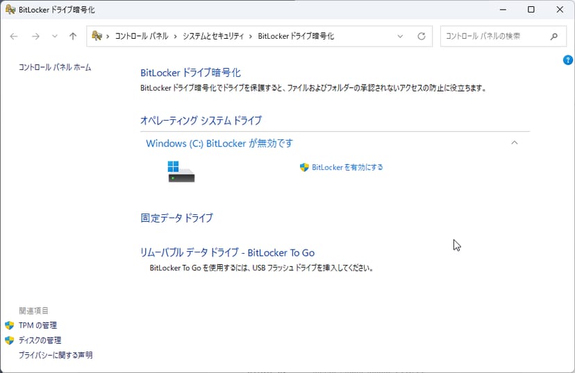 筆者の場合は「Windows 11 Pro」なので、ドライブごとのBitLockerの適用有無を変更できる。